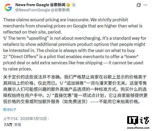 谷歌不只正在社交平台 X 上公开回应,谷歌商务智能体目前并不具备按照用户小我数据调整零售商订价的功能。这是铁律。例如,谷歌颁布发表推出合用于人工智能购物智能体的全新通用商务和谈(UCP)后不久。